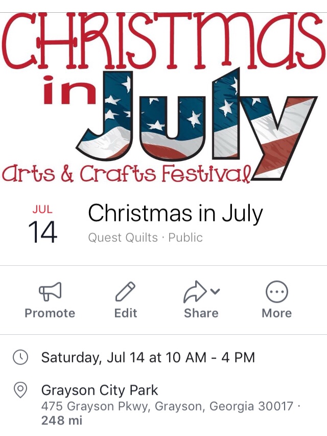Christmas in July I’m doing a show on July 14th. Feel free to drop by. Share this:Share on Tumblr Click to share on Reddit (Opens in new window) Reddit TweetLike Loading... Related Author: Quest Quilts Just your average citizen who loves literature and quilts and has an uncommon proclivity for both. View all posts by Quest Quilts