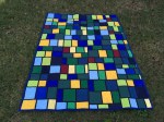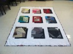 A memory quilt made from nice business causal clothes. This lady was an artist, so I arranged it by color and placed her own artwork in the middle.