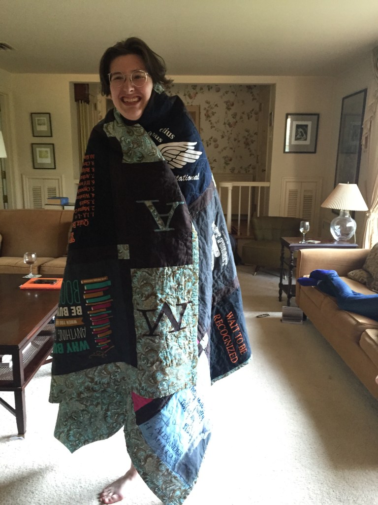 Previous Image Next Image IMG_2637 A graduate holding her t-shirt quilt. I think she liked it. Share this:Share on Tumblr Share on Reddit (Opens in new window) Reddit TweetLike Loading...