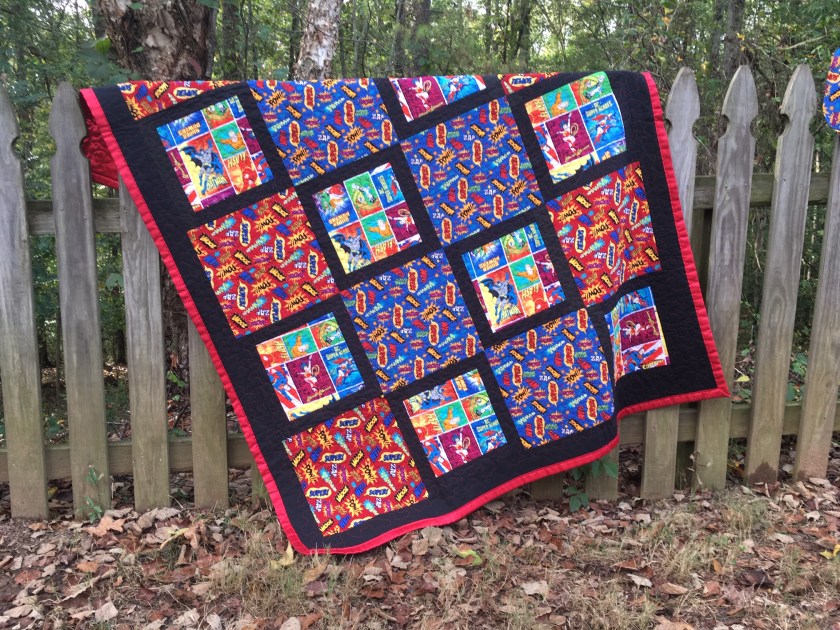 I was able to finish my t-shirt quilt commission and baby Flash quilt commission right when school started. Now, I’m on to another undisclosed project, a bookshelf quilt for a church retreat, a Star Wars quilt (or two) for the upcoming craft fairs, finishing my comic book quilt and second guitar quilt. I also have a partially begun other undisclosed project as well as a promised project that hasn’t even been started. Oh, and there’s another t-shirt quilt waiting to be started, but the timeline is very generous, so it’ll be a while before I start it.