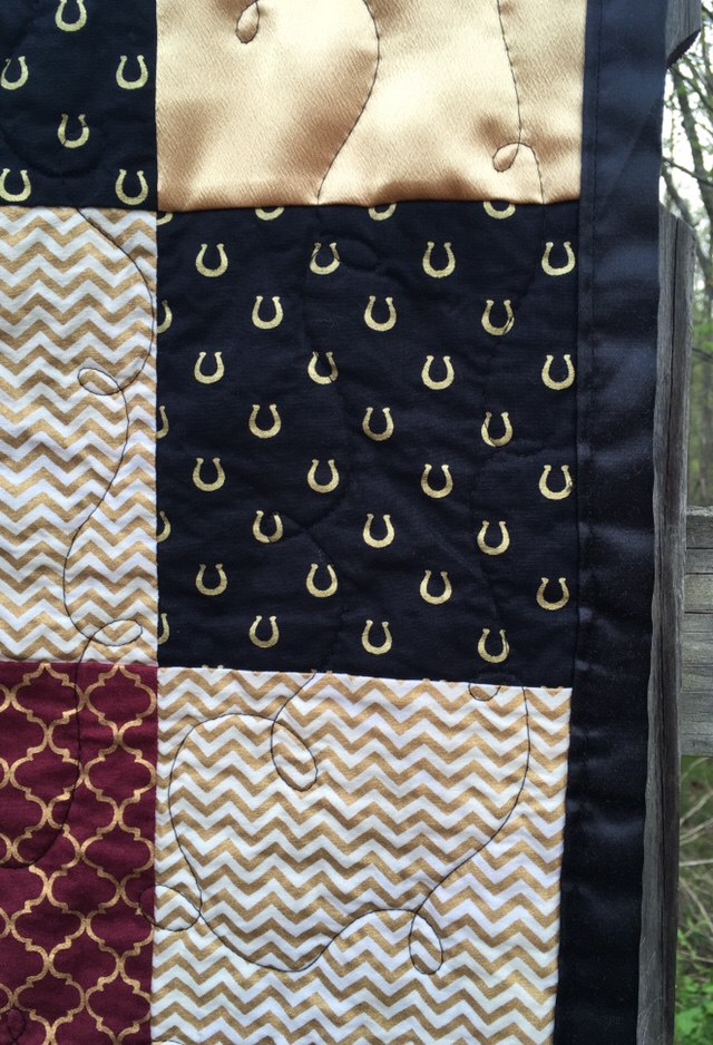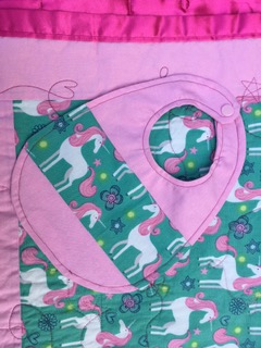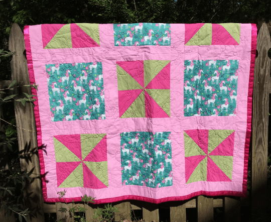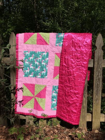 The unicorn quilt began with one simple, silly goal. I wanted to make the absolute stereotypical girliest quilt ever. I included unicorn fabric, sparkly pink fabric, pinwheels, and a smooth hot pink flannel-backed satin for the backing. Even the quilting pattern was in theme as I drew hearts, stars, and flowers throughout the quilt. I have also made a matching bib for those who thought this would make a great baby shower gift. I do think this may be my most over the top quilt to date!