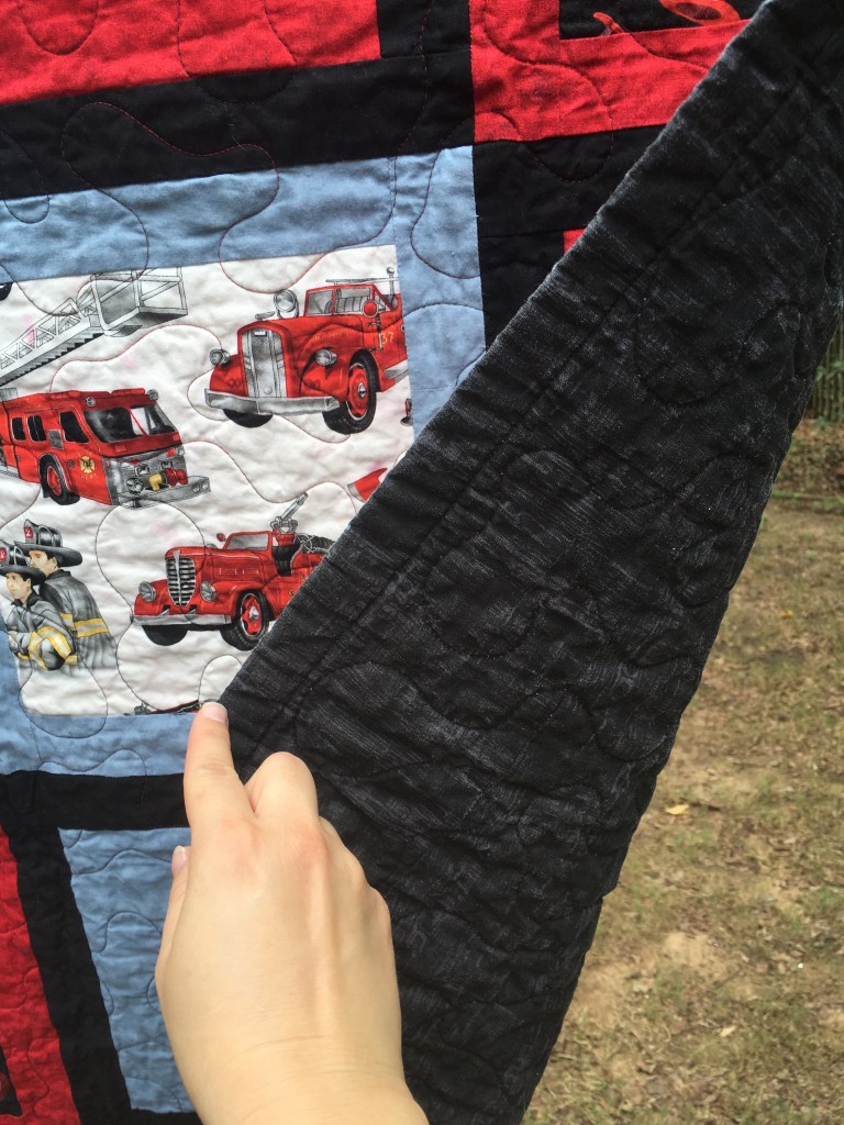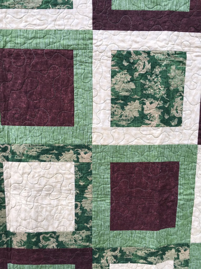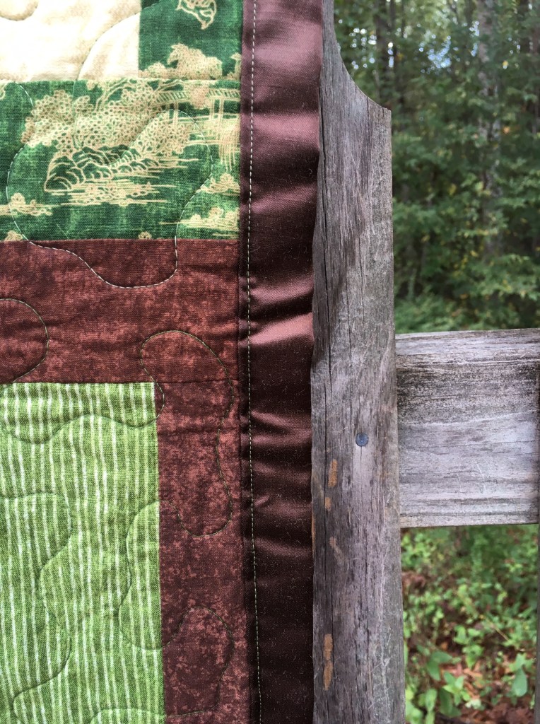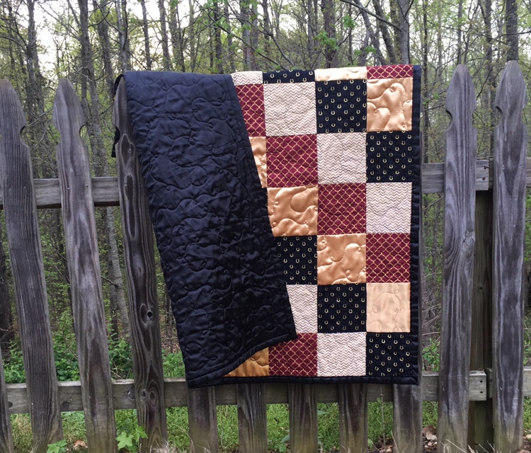 The dragon quilt was fun to do because the fabric itself isn’t over the top. It has a stylish East Asian design that includes a dragon motif. I like this one because it isn’t over the top and would look nice in a lot of living areas and not just in one of someone who was dragon obsessed. This quilt strikes me as great for someone who maybe likes anime but is also trying to have a more mature presence. Like the other quilt, this one was part of a run I did when I was very fascinated with flannel-backed satin. It just feels so awesome that I ended up making several quilts with that fabric on the back.