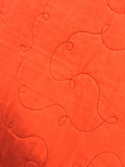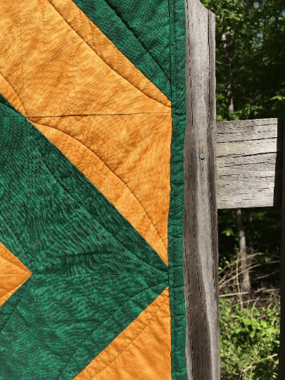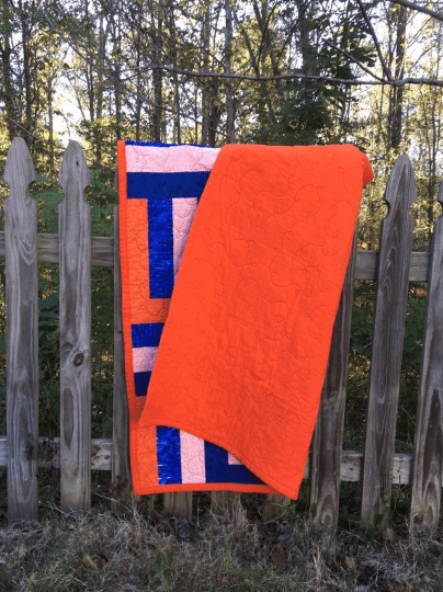 These little 4′ x 4′ quilts have been around for a while. When I first started making ready-made quilts, I made a bunch in the colors of the local schools, especially ones where I knew my shows would be close to. They’re also conveniently the colors of college and pro teams as well. I liked the idea of school colors but with a subtle nod. I’ve sold a good many, actually, but these last five have hung around. I actually have a bib for the orange and blue, so it would make a good baby gift.