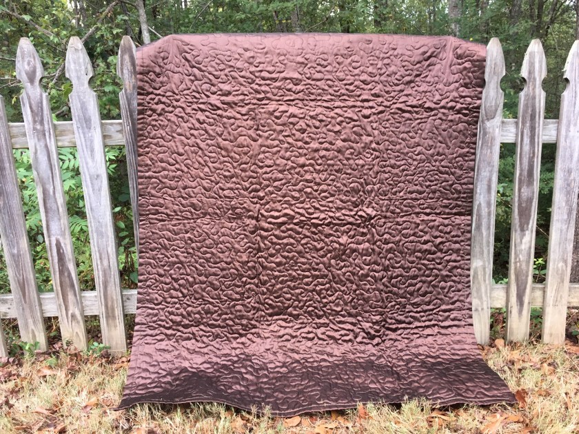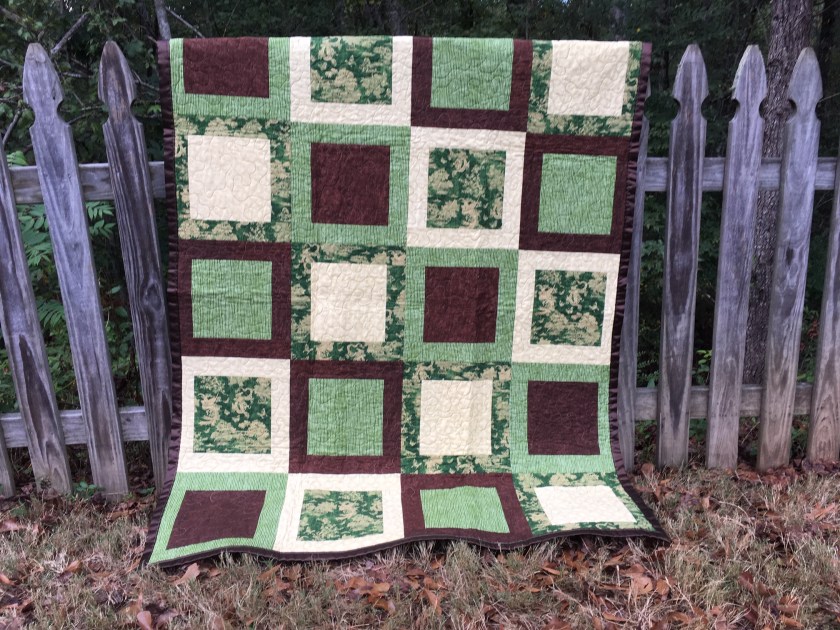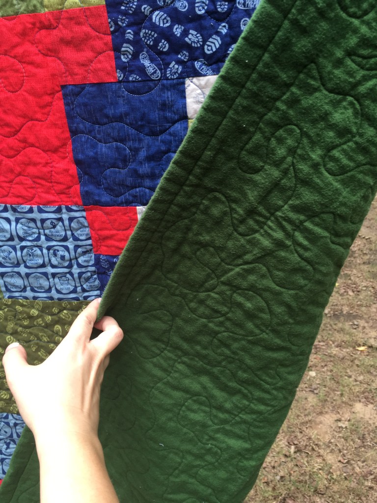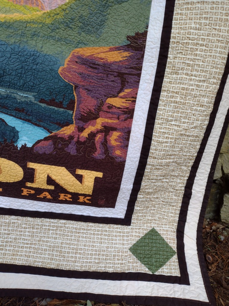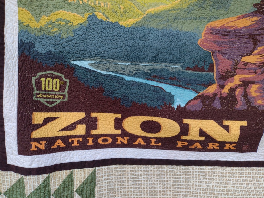I haven’t been taking commissions, but it’s been nice to work on some projects I’ve had on hold while doing grad school stuff. I have been sitting on this Zion National Park quilt panel for a while now. There’s an entire line of them, actually, and I am in love! I haven’t ordered any specific parks, but I was able to find this panel and another Mt. Rainer one at a local fabric store that specializes in remnants. It’s a fun sort of treasure hunt, and there are always a few specific fabric lines I’m on the lookout for when I go. The National Park line is one of them. I was also able to finally give the “flying geese” pattern a try. It was pretty good, actually! The back of the quilt is brown.