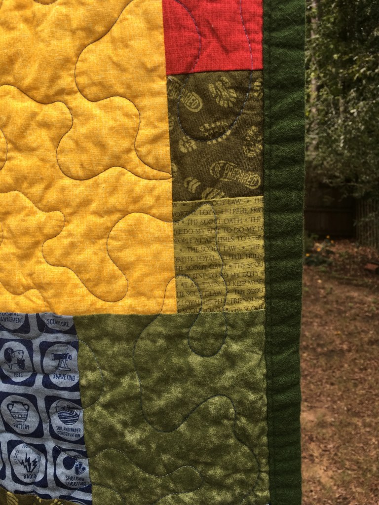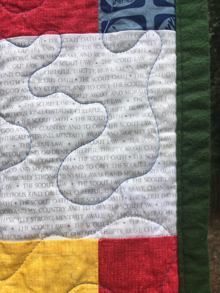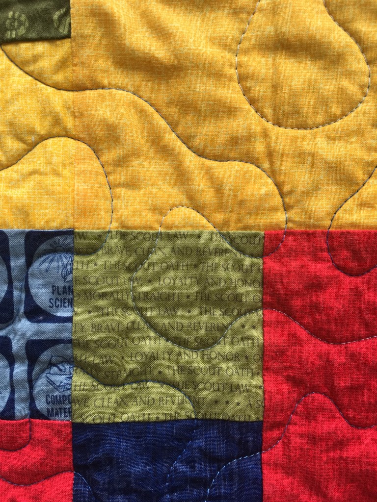 I actually have two of the Boy Scout quilts as well. These are neat because they have smaller details in the fabric. Look closely at some and you’ll see the Oath. My favorite fabric on these quilts is the knot fabric, but the merit badges design is a close second. They have flannel on the back, and I thought they might make a great cover while on a camp out. I played around with the mosaic design here and ended up liking the effect.