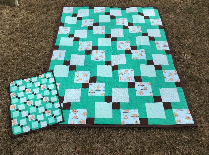 I had just enough of the sloth fabric to make two lap quilts and one matching doll quilt. As always, the name of the game is to use fabric I already have in my fabric stash. That being the case, each of the lap quilts has a different shade of aqua as a result. But I am happy I was able to manage to stick to my goal. The backing ended up being brown flannel-backed satin. I just LOVE the way it hangs and how it feels. I can easily see some toddler using this as a lovey.