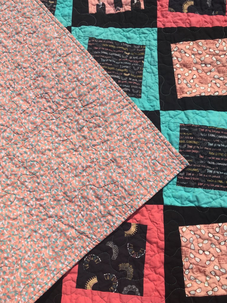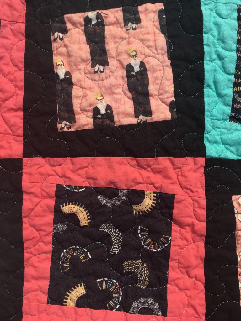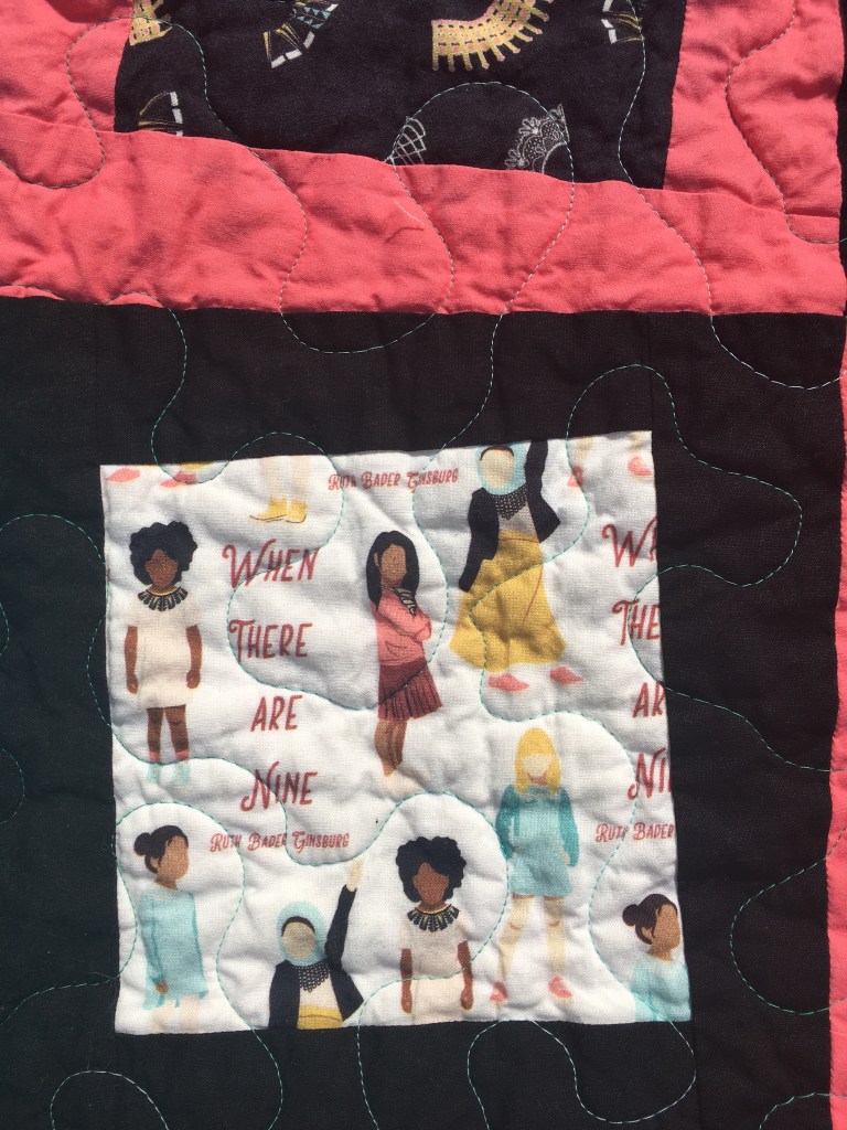 I found fabric based on Justice Ruth Bader Ginsburg, and it’s precious! Some of the fabric features her quotes, some her glasses, some her iconic collars, and my favorite – her small figure with a crown (a nod to her nickname the “Notorious R.B.G.” which is a play off the Notorious B.I.G., rapper Biggie Smalls.)
