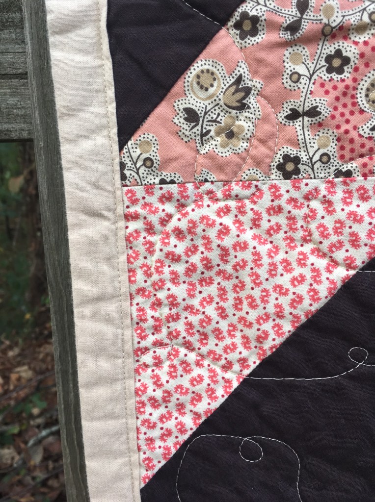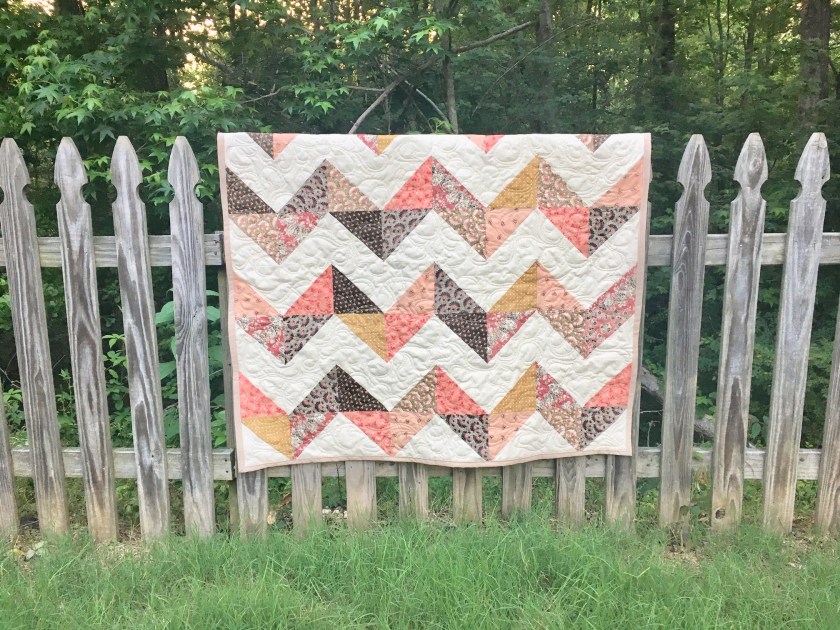 The last one in this series is a fun little Muppet quilt that features the old gang from the original Muppet Show! The feature fabric was fairly busy, so I had to try and build a quilt around it that would make the feature fabric pop without everything being overly busy. I focused on less typically feminine colors because part of me thought that a more mature Muppet fan might also like it. It does also come with a matching Muppet bib for the younger fans, though.