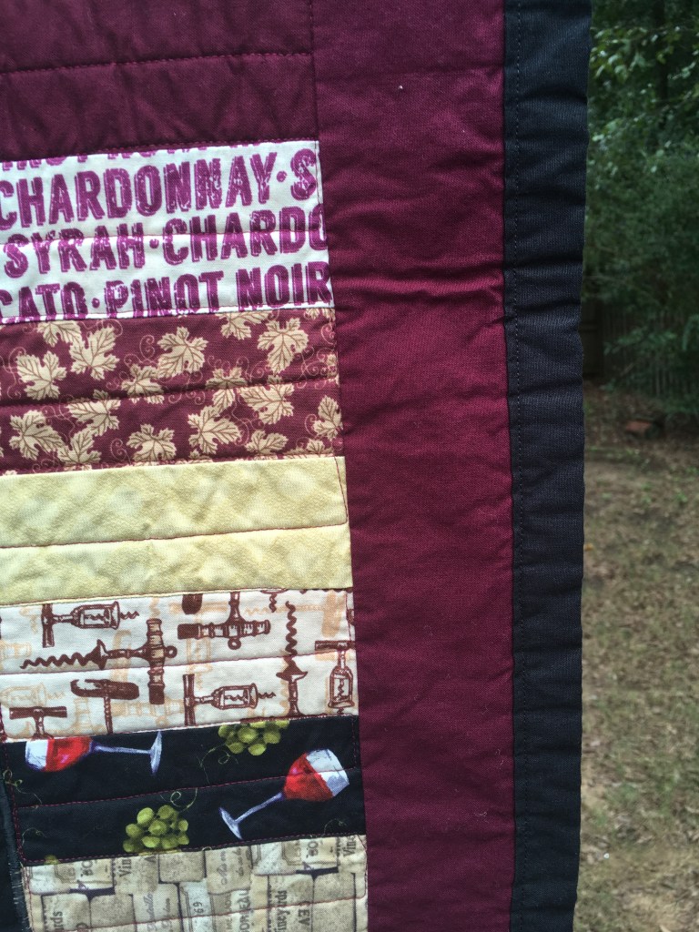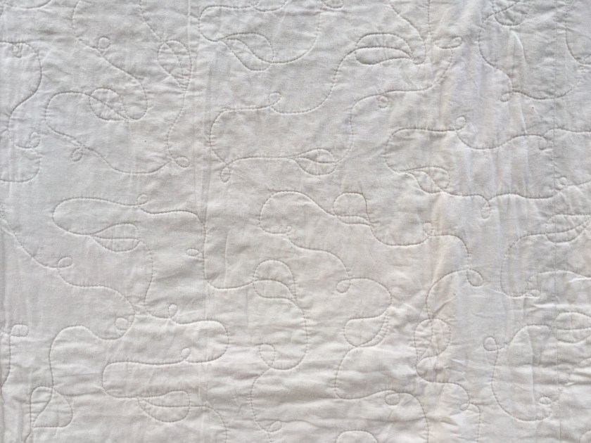 The Justice League quilt came about because I’d been holding on to some neat fabric and finally was able to make a quick, fun quilt with it. My favorite part of this quilt, though, is definitely the smooth backing that is flannel-backed satin. I like to think some child with a sensory issue would particularly like it as it seems to be made for rubbing between two little fingers. It does come with a reversible bib the feature comic book word splashes.