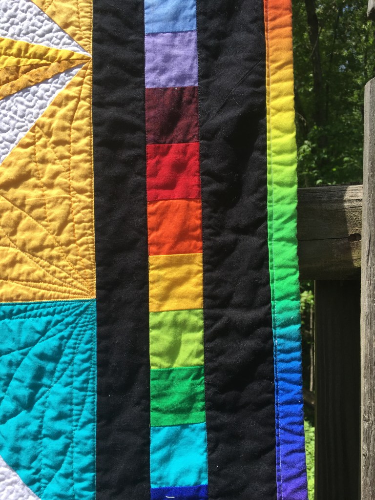 I’m in love with the colors and really wanted to show a gradient with the rainbow shades. I’m proud that I was able to use all fabric that I already had on hand except for the white fabric. The border was an afterthought when I realized it needed something it help bring all the colors in line. The backing was fabric I’d bought on a whim, but I was in love with it. I used the rainbow on it to adjust the colors on the front. This has to be one of the prettiest ones I’ve made; it’s certainly one of the more technically difficult. My hope is that it finds a home where someone will hang it on a wall as a central focal point.